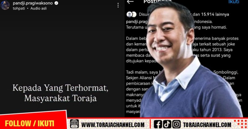 Torajachannel.com, Jakarta– Komika ternama Indonesia, Pandji Pragiwaksono, secara terbuka menyampaikan permohonan maaf sebesar-besarnya kepada seluruh masyarakat Toraja yang merasa tersinggung dan terluka atas materi lawakannya dalam pertunjukan “Mesakke Bangsaku” pada tahun 2013.