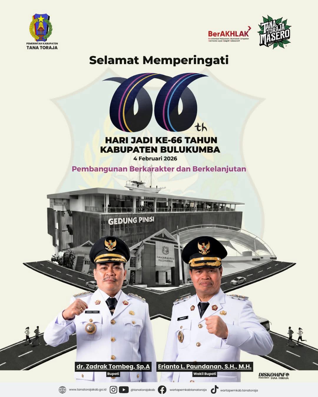 Bupati Tana Toraja, dr. Zadrak Tombeg, Sp.A bersama Wakil Bupati Tana Toraja, Erianto L. Paundanan, S.H., M.H berharap di usia yang ke-66 tahun, Kabupaten Bulukumba semakin maju, berdaya saing, dan terus bertumbuh melalui pembangunan yang berkarakter dan berkelanjutan.