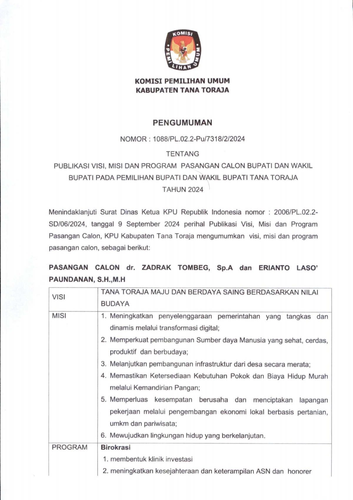 Torajachannel.com, Tana Toraja– Komisi Pemilihan Umum (KPU) Kabupaten Tana Toraja telah resmi mengumumkan visi dan misi dari para calon Bupati dan Wakil Bupati untuk pemilihan kepala daerah (Pilkada) yang akan digelar pada tahun 2024.