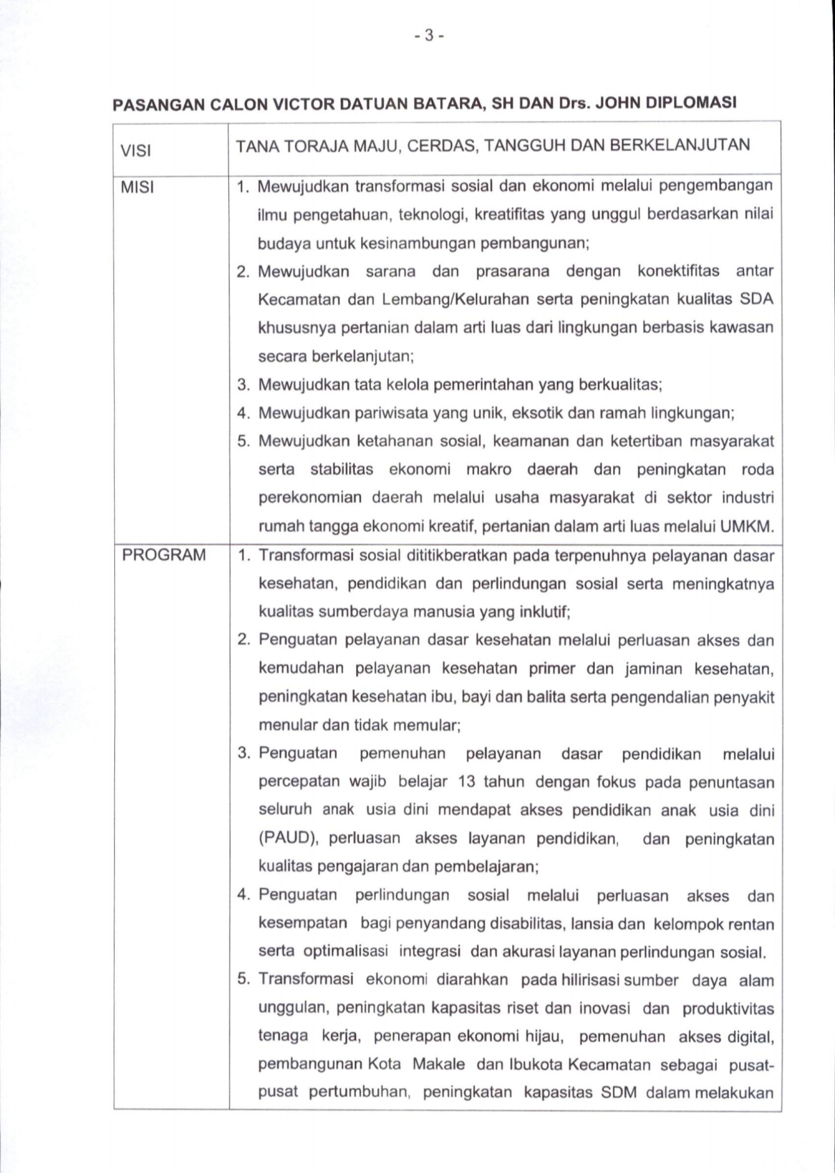 Adapun Visi-Misi kedua pasangan calon Bupati dan Wakil Bupati Tana Toraja pada pilkada 2024 sebagai berikut :